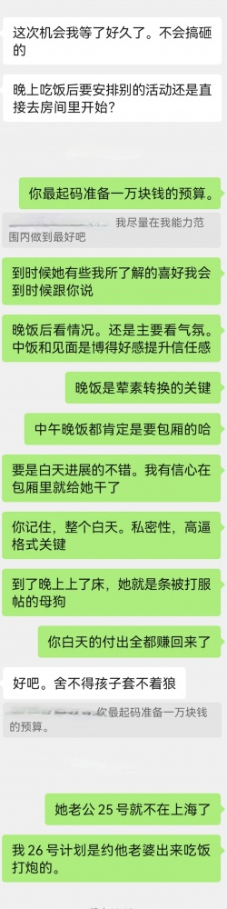 两大淫贼的谋划越来越具体,看的我是血脉膨胀~ 这种感觉又有点第一次老婆跟老崔偷情前老崔向我汇报情况的感觉了~